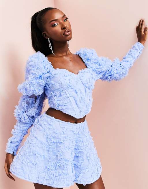 ASOS LUXE 3D lace corset top with puff sleeves in blue part of a set