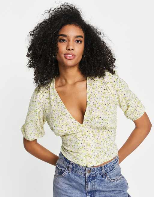 ASOS DESIGN button front tea blouse with volume sleeves and tie back detail in yellow ditsy print