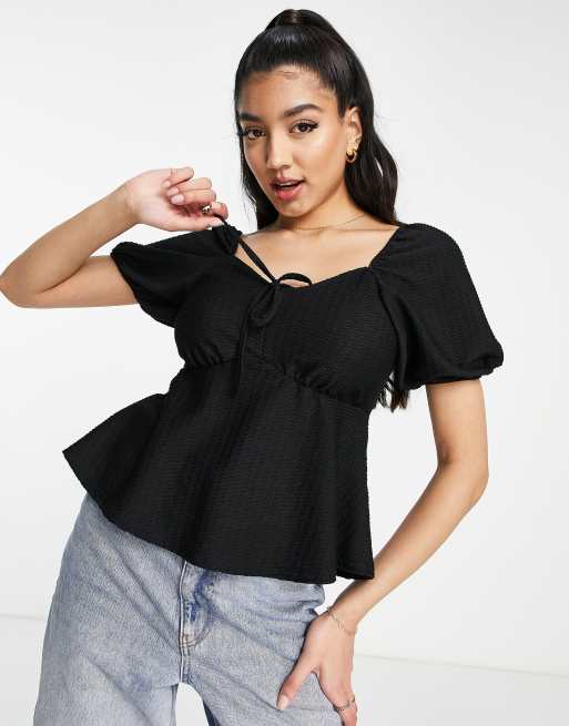 Puff sleeve top clearance new look, Black Textured Puff Sleeve Peplum Top New Look clearance