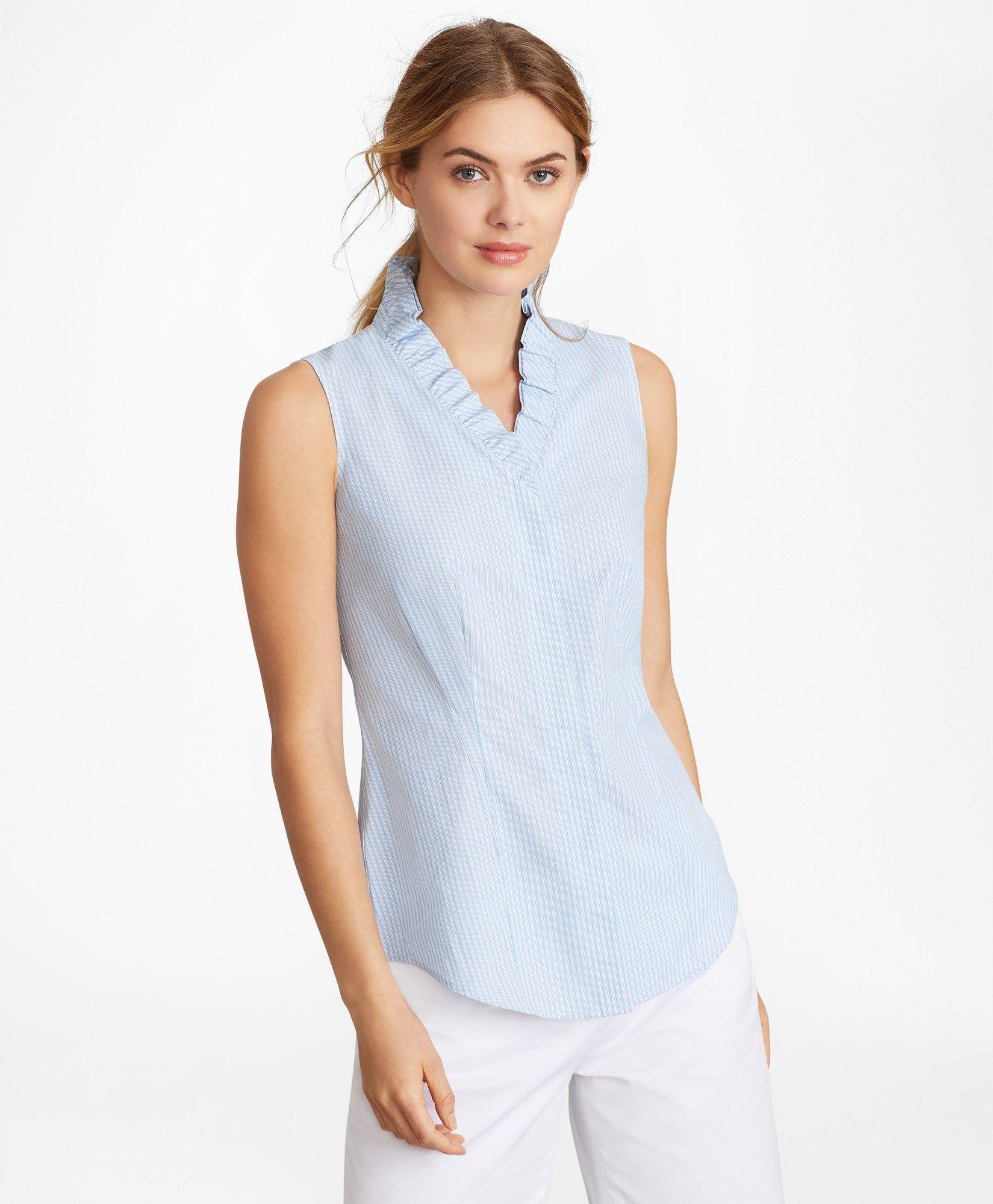 Sleeveless blouse with clearance collar, Non Iron Striped Supima Cotton Ruffle Collar Sleeveless Blouse clearance