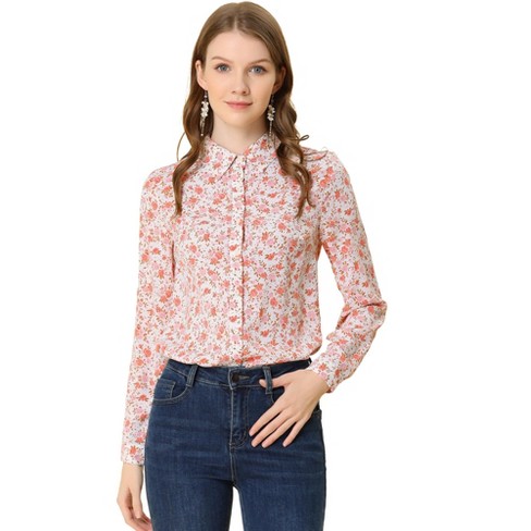 Allegra K Women s Point Collar Long Sleeve Button Down Floral Shirt White Pink Floral Small