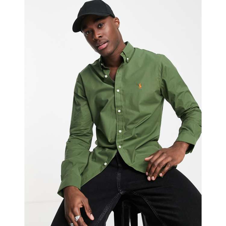 Polo Ralph Lauren icon logo slim fit cotton stretch poplin shirt in olive green