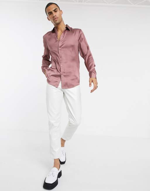 ASOS DESIGN skinny satin shirt with camp collar in dusky pink