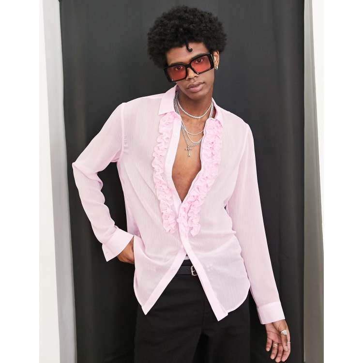 ASOS DESIGN regular sheer ruffle front shirt in pink