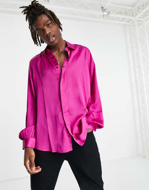 Pink silk shirt clearance ladies, ASOS DESIGN satin shirt with volume blouson sleeves in bright pink clearance