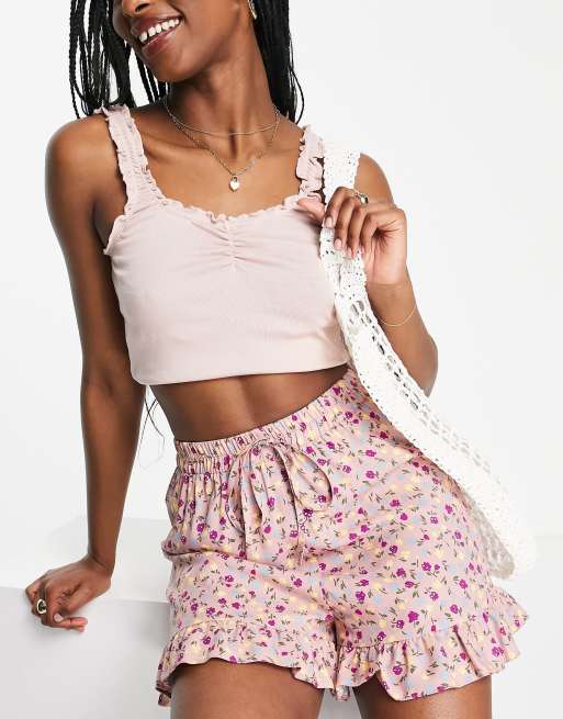 ASOS DESIGN elasticated waist shorts with frill hem in pink based