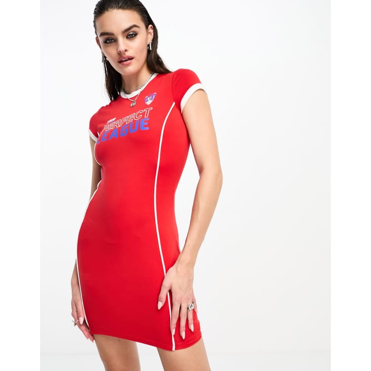 Red Cap Sleeve Curve Hem Sports Stripe Bodycon Dress