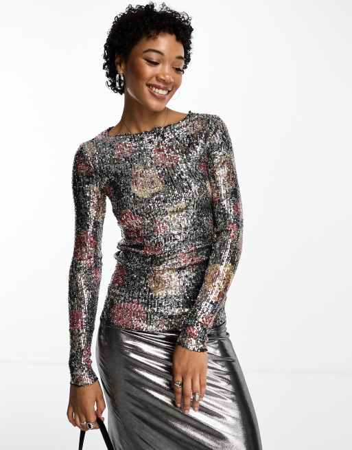 Free people sequin clearance t shirt dress, Free People long sleeve floral sequin top in silver ASOS clearance