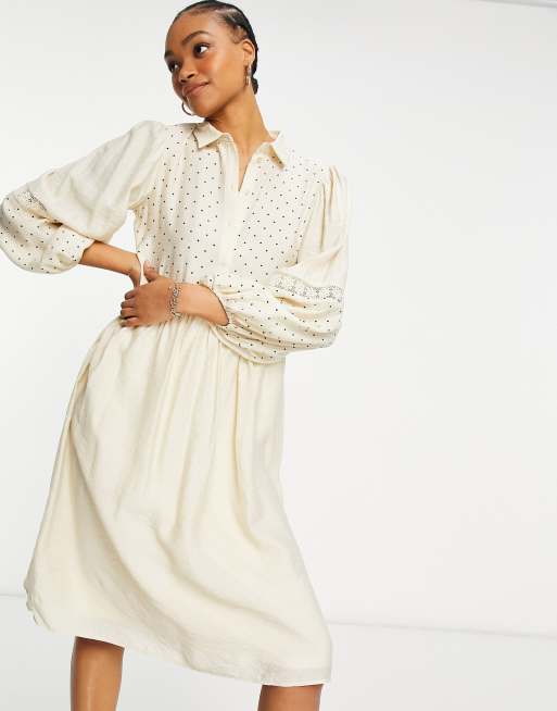 Vila polka dot midi shirt dress with crochet insert in birch