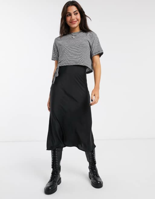 AllSaints benno lin stripe t shirt 2 in 1 slip midi dress in black