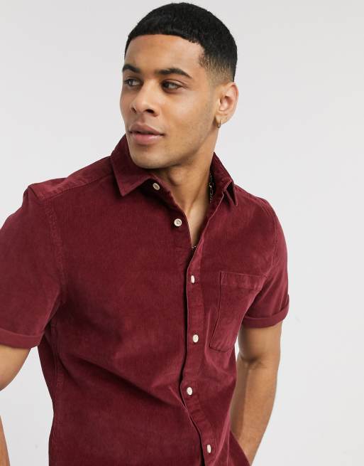 ASOS DESIGN short sleeve stretch slim cord shirt in burgundy ASOS