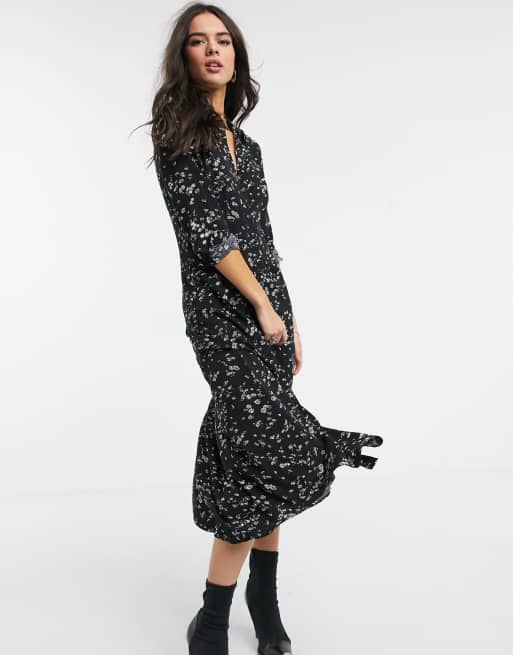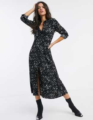 WAREHOUSE Daisy Print Midi Shirt Dress in Black Pattern Endource