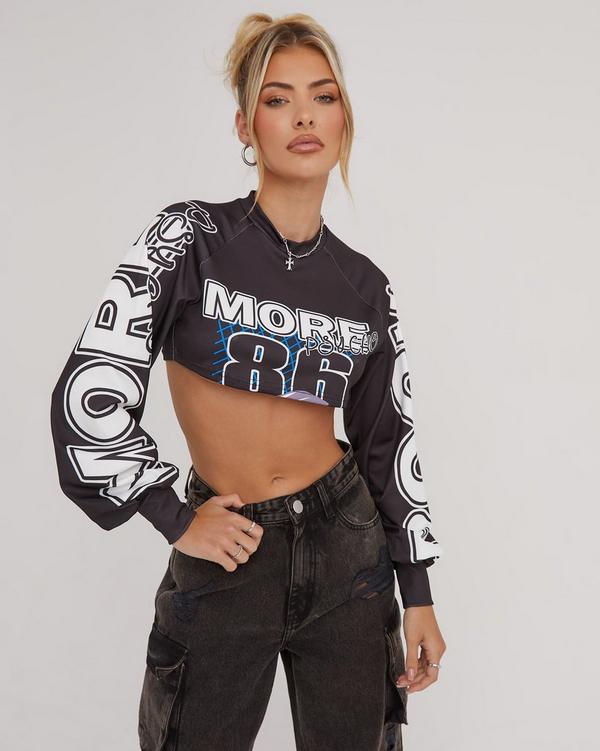 Long Sleeve Motocross Detail Crop Top In Black EGO