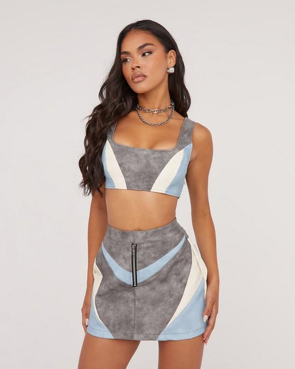 Square Neck Motocross Print Crop Top In Grey Faux Leather EGO