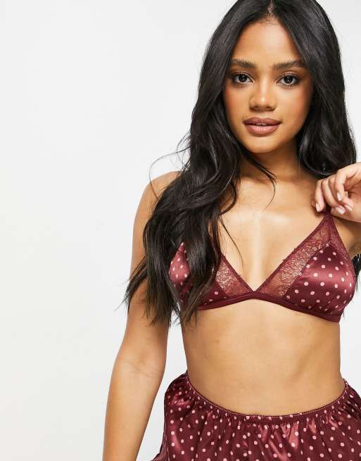 Pull Bear satin spotty triangle bra with lace trim co ord in red