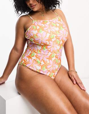Brave Soul Plus off shoulder frill swimsuit in pink ASOS