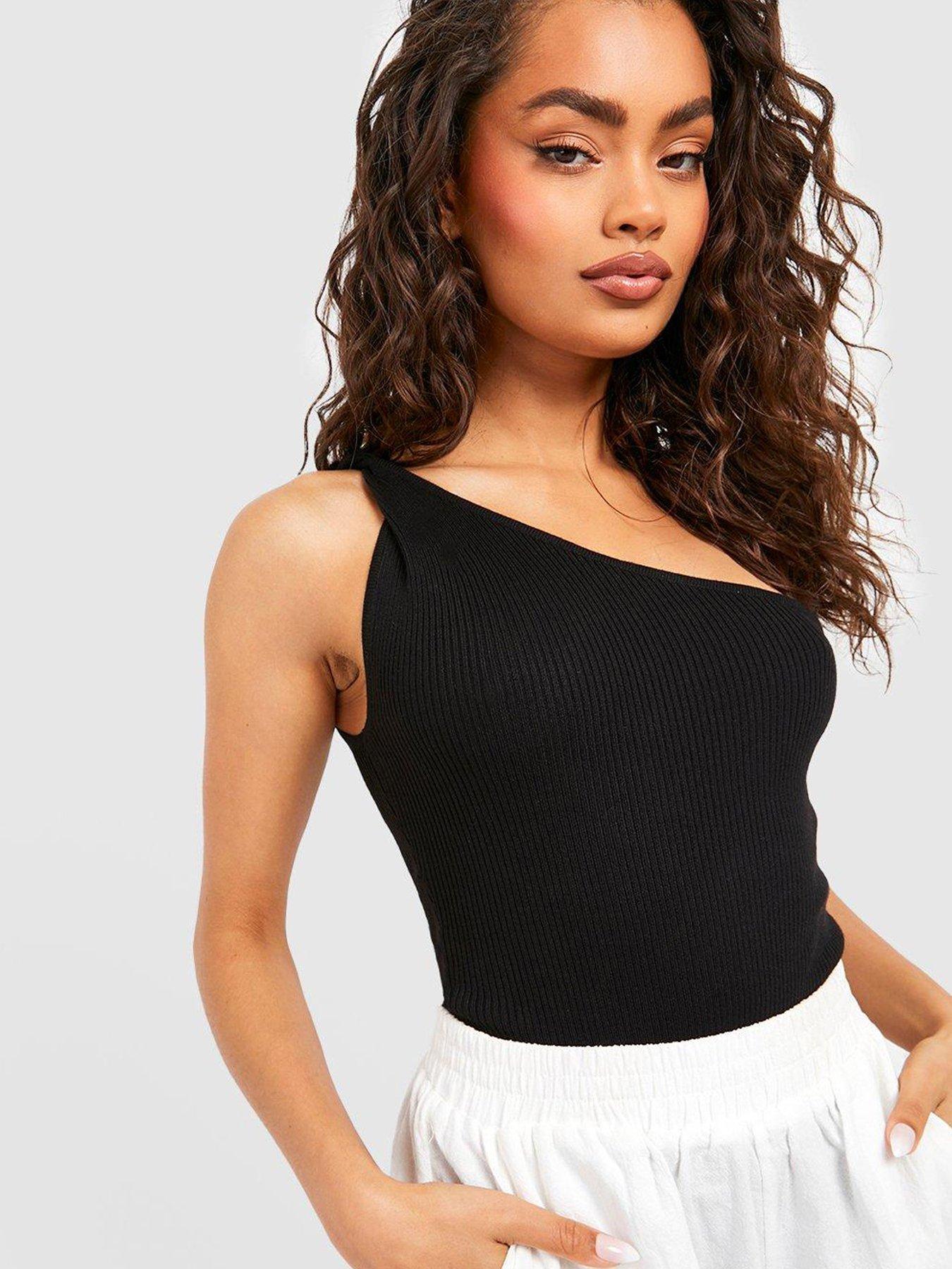 Boohoo clearance black bodysuit, Boohoo Twist Shoulder One Sleeve Rib Knit Bodysuit Black Very clearance