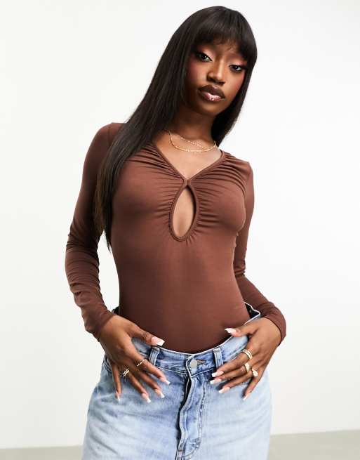 ASOS DESIGN bodysuit with ruched keyhole detail in chocolate brown