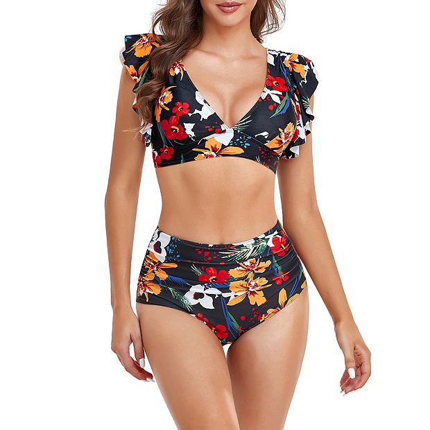Two Piece Bikini Set For Women Ruffle Sleeve Swimsuits Floral