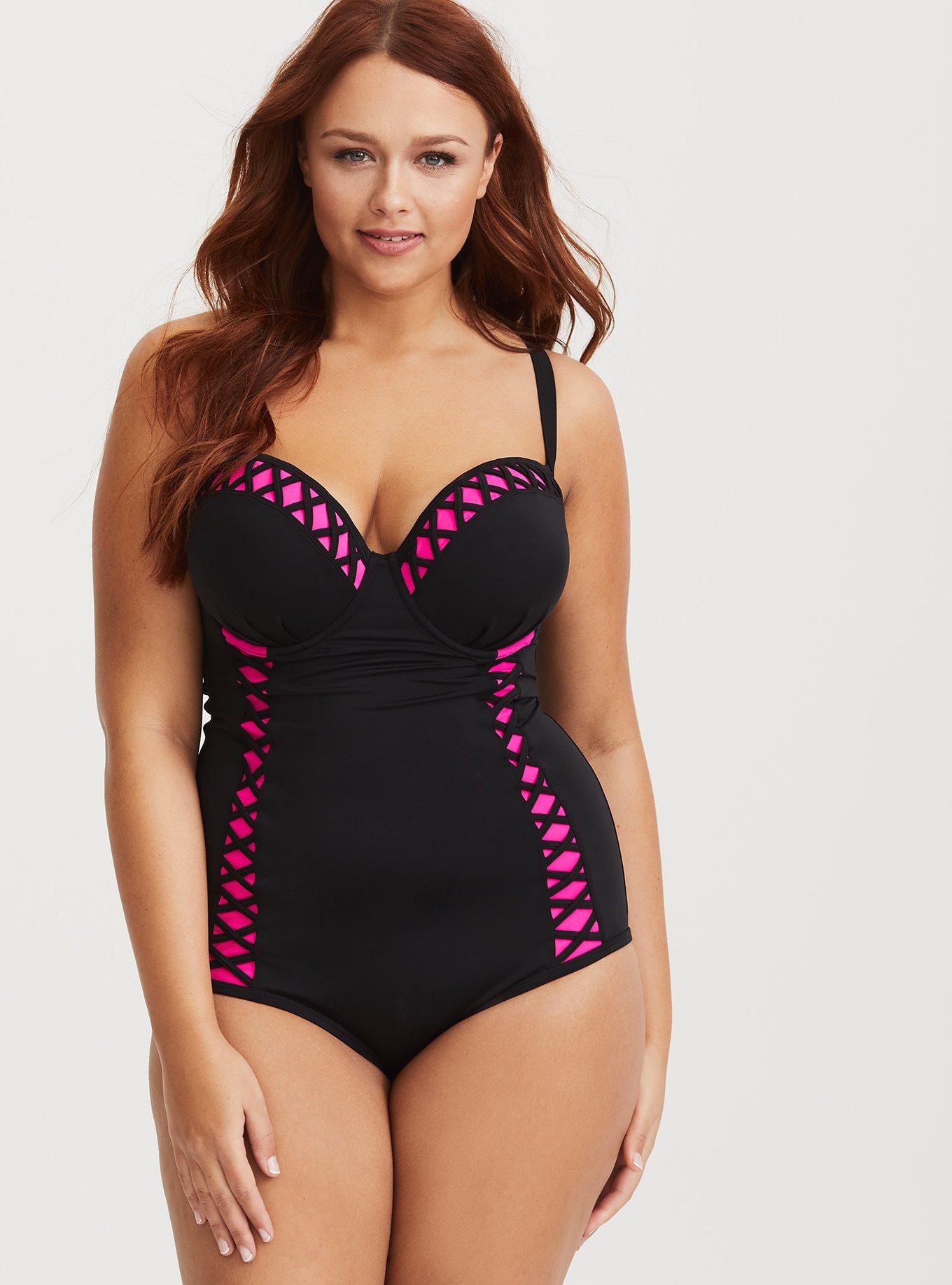 Plus Size Black Lattice Pink Peekaboo Push Up Demi Swimsuit