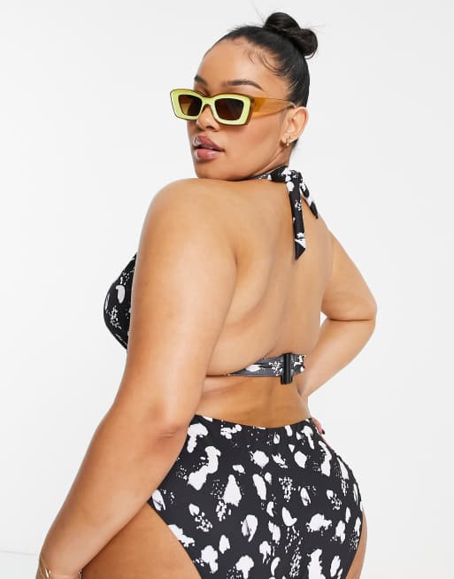 ASOS DESIGN Curve mix and match halter plunge bikini top in mono spot print