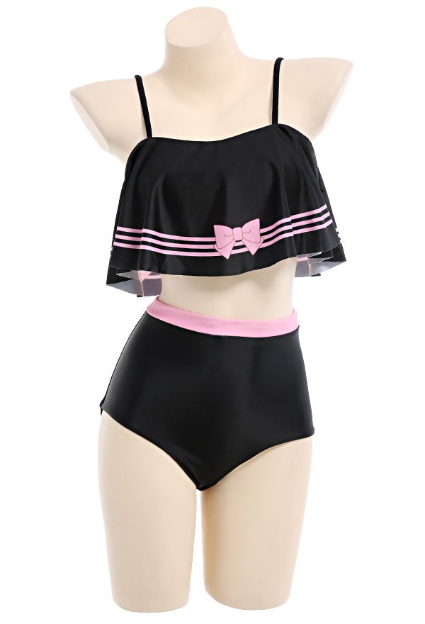 Swimming Suit Black Pink Bowknot Pattern Ruffled Bathing Suit Two Piece Swimwear