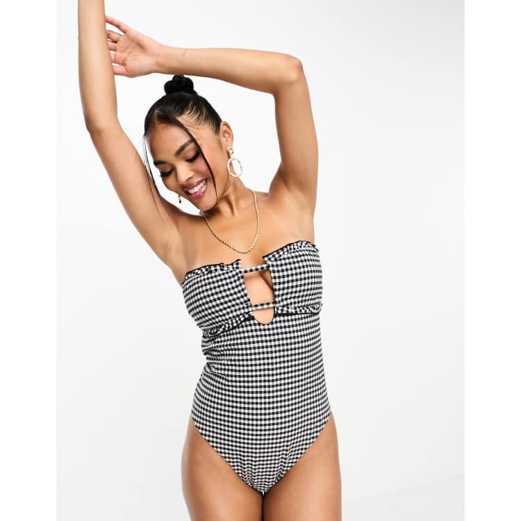 ASOS DESIGN seersucker bandeau frill swimsuit in mono gingham ASOS