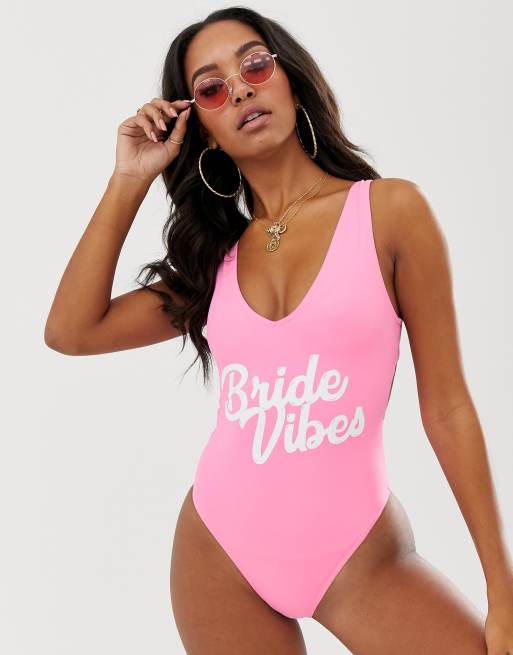 Hen do swimming clearance costumes, ASOS DESIGN recycled bride vibes slogan hen plunge lace up back clearance