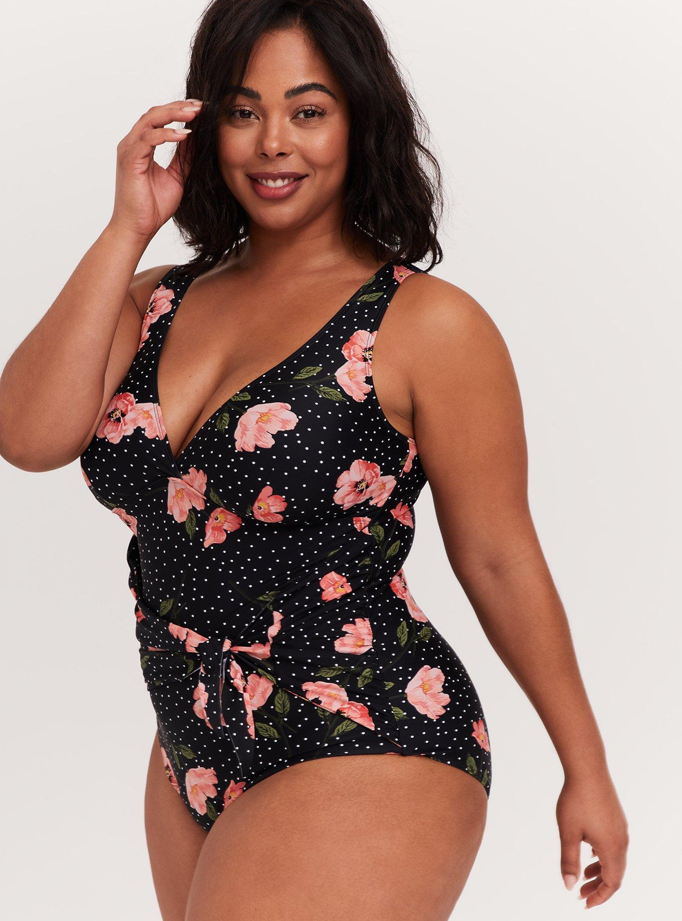 Plus Size Black Floral Polka Dot Tie Front Wireless One Piece