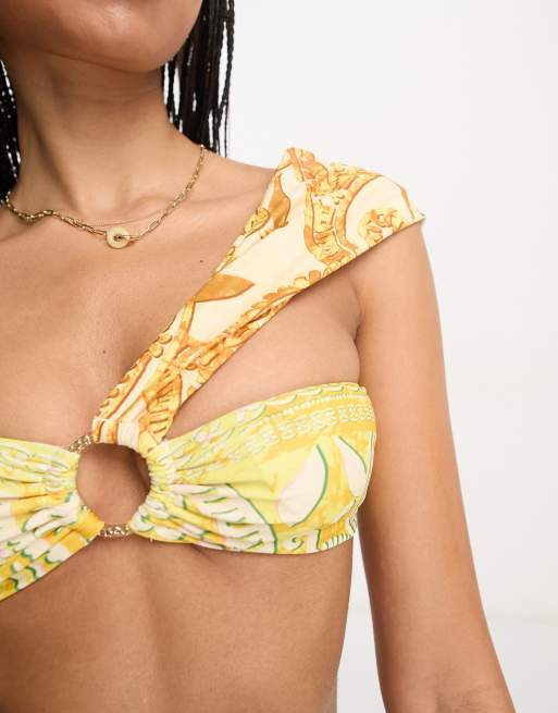River Island knot detail print bandeau bikini top in yellow