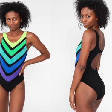 Bathing suits in clearance the 80s, Neon Striped Bathing Suit 80s One Piece Swimsuit Keyhole Bathing clearance