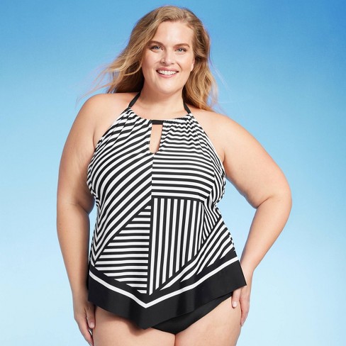 Women s Striped High Neck Keyhole Tankini Top Kona Sol Black 3X