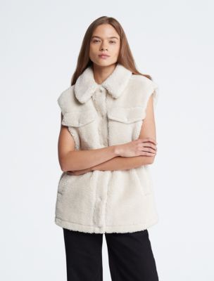 Calvin Klein Sherpa Vest Women M White Zip Pockets Fleece vest