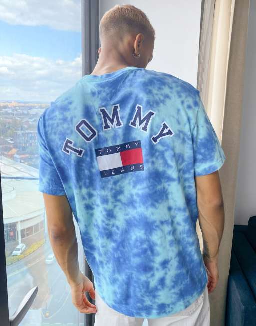 Tommy Jeans tie dye limited capsule back flag logo print relaxed fit t shirt in blue