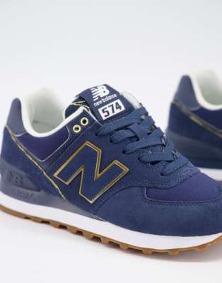 New balance 574 clearance blue and gold, New Balance 574 trainers in navy with gold piping clearance