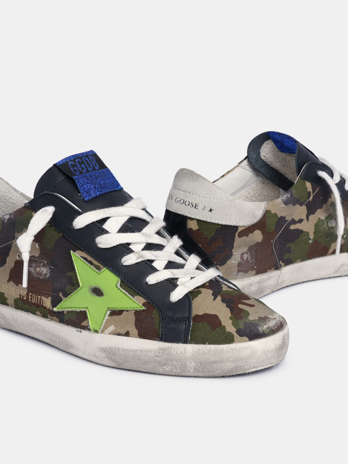 Super Star sneakers with camouflage upper and fluorescent yellow leather star