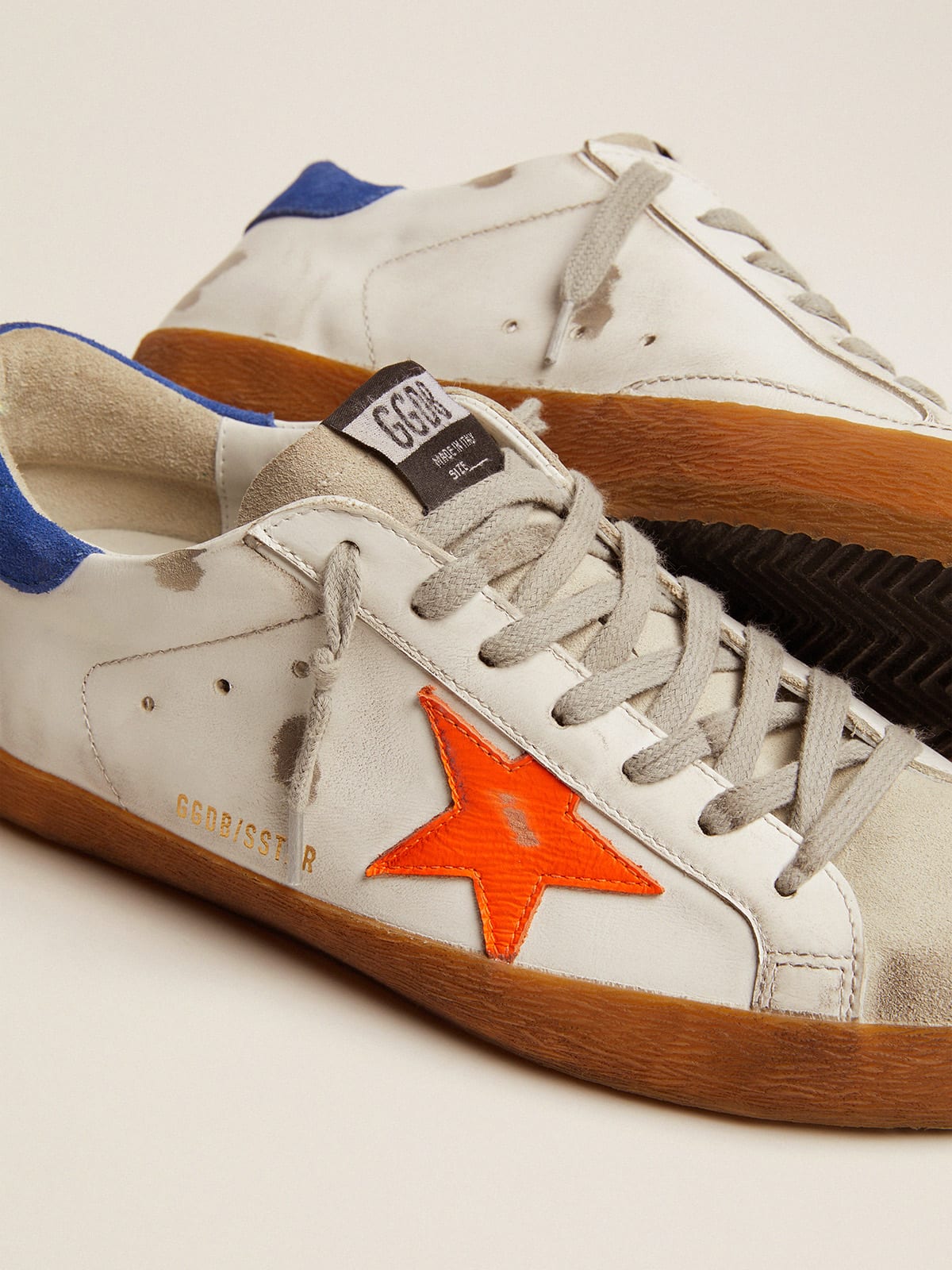 Super Star sneakers with blue suede heel tab and neon orange star