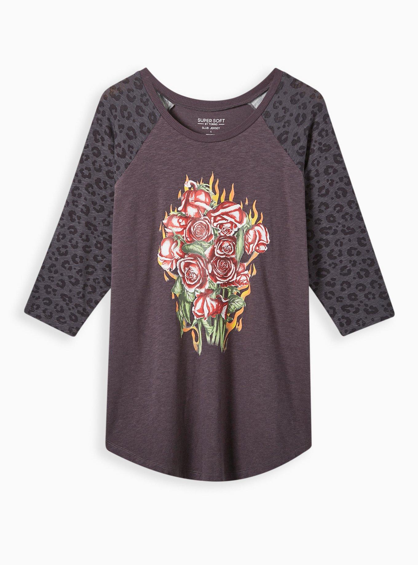 Plus Size Baseball Tee Super Soft Slub Roses Leopard Grey