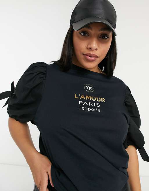 River Island Plus T shirt in zwart met pofmouwen met oogjes