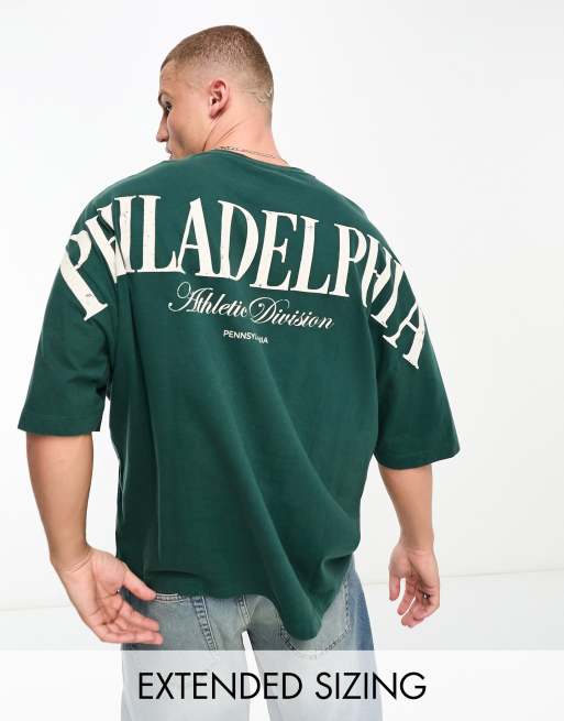 ASOS DESIGN Oversized T shirt met Philadelphia print op de achterkant in groen met wassing