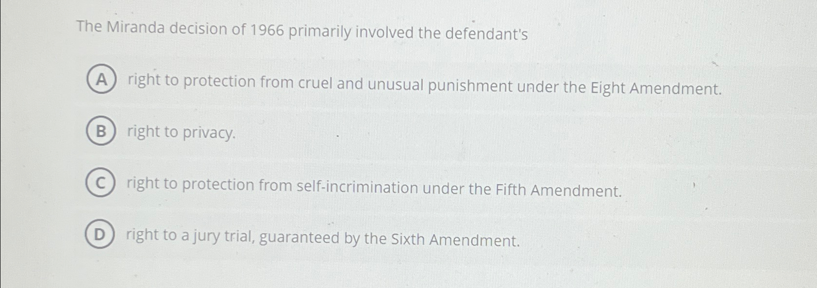 The clearance miranda decision, Solved The Miranda decision of 1966 primarily involved the clearance