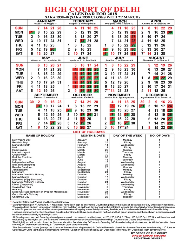 Delhi High Court Calendar 2018 PDF Public Holiday Festival