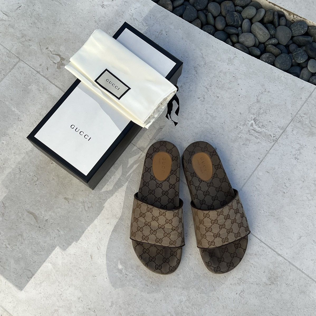 Men's gg canvas clearance slide sandal, stores online Gucci Men s GG Canvas Slide Sandal clearance