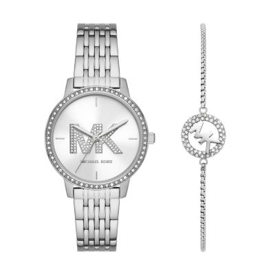 Michael Kors Three Hand Stainless Steel Watch and Slider Bracelet