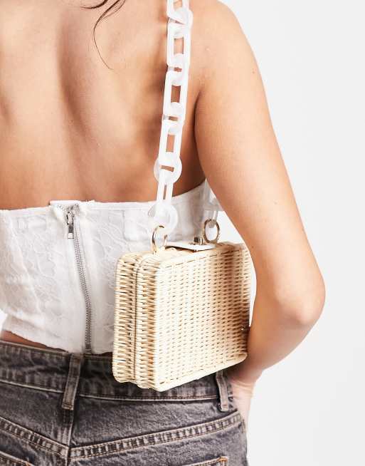ASOS DESIGN shoulder bag with white resin handle in rattan straw