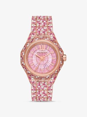 Michael Kors Oversized Lennox Womens Glitz Watch Pink Crystals Rose Gold Steel