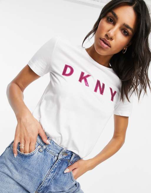 DKNY Short Sleeve All Over Sequin T Shirt Black SM at Amazon