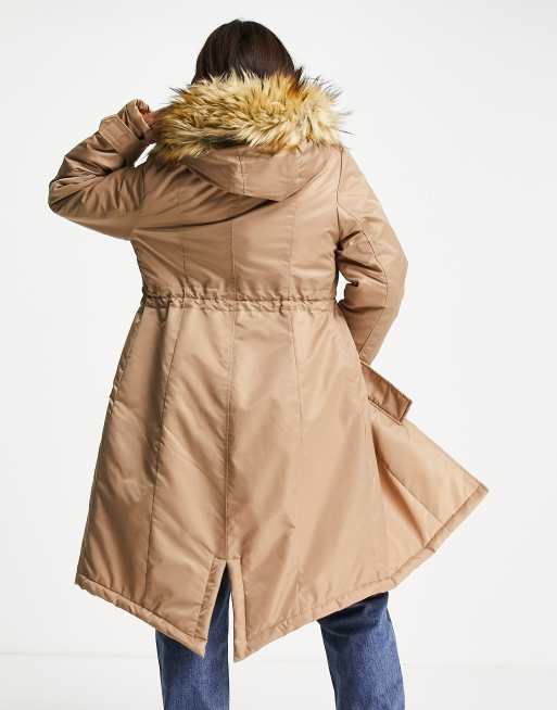 French Connection faux fur lined parka coat in beige and mustard
