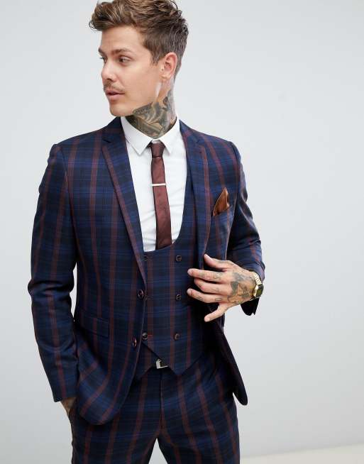 Maroon and navy clearance suit, Harry Brown navy and burgundy check slim fit suit jacket clearance
