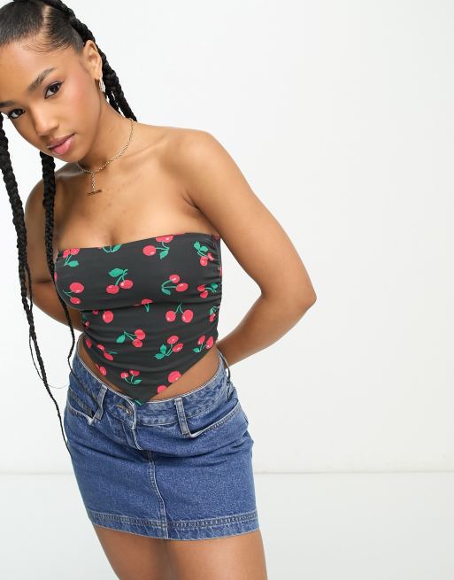 Designer clearance bandeau scarf, ASOS DESIGN scarf hem bandeau top with ruched sides in cherry print clearance